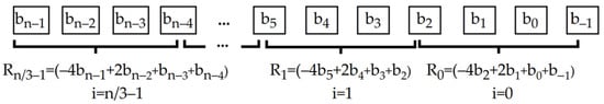 To correctly process bit 0 (with power ), the bit grid has to be expanded by introducing the summand . The introduction of this summand does not violate the expression because the zero bit is used for expansion, i.e., . The brackets in expression (2) do not change the order of operations but illustrate the representation of each bit with numbers from the row {2, 5, 8, 11, …, 3i–1} for 0 ≤ i ≤ n/3–1. Next, let us perform the regrouping of the summands. The regrouping is also shown in the parentheses in the following expression: