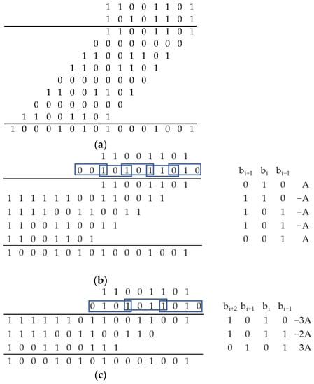 Example of multiplication of two numbers A = (11001101)2 and B = (10101101)2 using different algorithms: (a) traditional multiplication algorithm; (b) Booth’s algorithm; (c) proposed algorithm.
