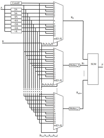 Analysis of the traditional matrix multiplier shows that the largest delay in the calculation is caused by the summation of partial products (PPs). Reducing their number reduces the summation time. Booth’s method of implementing multiplication by groups of bits is widely spread in practice. The hardware implementation of this method is known both on the basis of the FPGA and on the application-specific integrated circuit (ASIC) [,,].