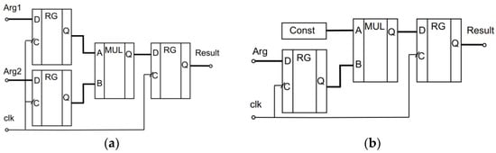 To increase the multiplication speed, various algorithmic methods have been developed. The first group of methods is based on decreasing the number of partial products by processing several digits of a multiplier simultaneously. These methods are based on Booth’s algorithm [], which performs multiplication by two digits at once, halving the number of partial products. A modified Booth’s algorithm [] is also used. It reduces the number of partial products by less than half but does not require any preliminary operations to compute the partial products. Subsequent modifications of Booth’s multipliers dealt with improving accuracy [,], minimizing the complexity of the design [], and accelerating the operation [,,]. There are also known extensions of Booth’s algorithm to perform more complex operations, such as the multiplication of three arguments [,]. The second group of multiplication optimization methods is related to paralleling the summation of partial products because the classical methods of summation (iterative and linear) are slow. One of the most effective methods of acceleration is based on the Wallace tree [], which implements the addition of different bits of partial products at the same time. Wallace tree implementations are also constantly being modified to minimize hardware costs [] and delays [,,]. Pipelining is used to improve the performance of multipliers []. Often, all of these methods are used simultaneously [,,].
