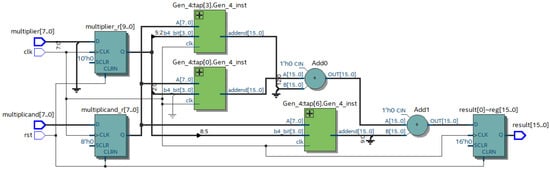 For the investigation, we used a parameterized description of the multiplier, allowing for a rapid change in its digit capacity. Figure 6 shows the result of compiling the prepared Verilog HDL description with a bit size of n = 8.