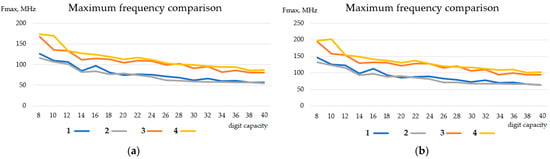 Maximum frequency of multiplier operation: (a) model Slow1, (b) model Slow2. The presented graphs were obtained for the following conditions: 1—multiplication of two arguments by Booth’s algorithm; 2—multiplication of two arguments by the proposed algorithm; 3—multiplication by a constant by Booth’s algorithm; 4—multiplication by a constant by the proposed algorithm.