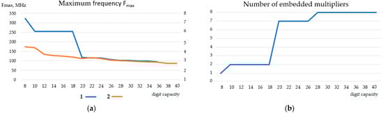 The embedded FPGA multipliers are configured as 9 × 9 or 18 × 18 units. This explains the nature of the graphs in Figure 14a. Embedded multipliers are fast, and when multiplying arguments with a digit capacity not greater than 18, they operate at maximum frequency. This frequency exceeds the frequency of the proposed three-bits-at-a-time multiplier by about twice. When the multiplier capacity exceeds 18 digits, the frequency decreases sharply and becomes the same as the frequency of the TBTM. This is due to the need of the cascading multiplier and the corresponding complication of the FPGA internal resources routing. In this case, the number of multipliers required increases dramatically. As Figure 14b shows, seven embedded multipliers are required to multiply two codes with a bit capacity of more than 18 bits. This is why there are sharp drops in the maximum frequency (Figure 14a) at the points corresponding to the digit capacities n = 10 and n = 20. That is, when cascading fast embedded multipliers, the time characteristics of the multiplier device fall sharply. Setting up embedded multipliers for multiplication by a constant does not change the timing characteristics of the resulting unit.