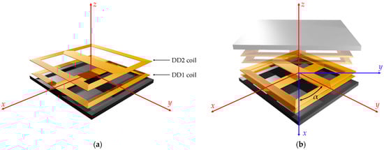 On the other hand, the receiver coil can be rotated to the transmitter coil, as presented in Figure 1b. The angle of rotation is marked with α. The coils are not rotated to each other if α is 0°. When α is greater than 0°, the DD1 transmitter coil is coupled to the DD1 and DD2 receiver coils. The same is true for the DD2 transmitter coil, which is also connected to the DD1 and DD2 receiver coils. The DD1 and DD2 coils on the transmitter and the receiver coil are still not coupled. The additional coupling complicates the mathematical model of the system by introducing an additional DD cross coupling, which is dependent on α.