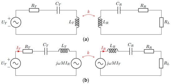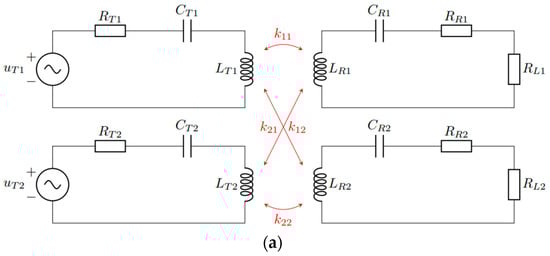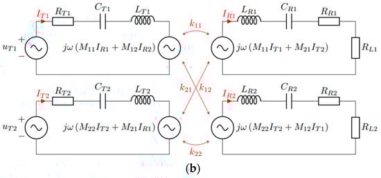 Figure 4 presents a simplified circuit of the system using a double DD coil structure. In addition to the coupling coefficient k11 between the DD1 coils and k22 between the DD2 coils, cross coupling between the DD1 transmitter and DD2 receiver coil is marked with k12, and cross coupling between the DD2 transmitter and DD1 receiver coil with k21. Figure 4a presents the simple circuit, and Figure 4b represent the link between the transmitter and receiver coil with voltage sources representing electromagnetic induction.