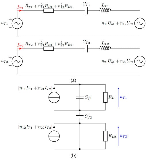 The circuit in Figure 4 is still complex. The transmitter and the receiver side are still separated, which leads to more complex circuit equations and therefore more complex models. The circuit can be simplified further to a reduced model, similar to the IPT circuit with the basic structure, described in [15]. The receiving side influences the transmitter side via the gain, marked with n11, n12, n21, and n22. The gain is dependent on mutual inductance between the coils: