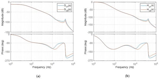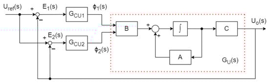 The proposed control scheme is presented with the block scheme in Figure 6. The open loop transfer function GU(s) of the system is marked with the red square with dotted lines. The system has two inputs and a single output. The inputs are the phase shift modulated voltage of the first and second full bridge high-frequency inverters. The first inverter excites the DD1 transmitter coil, and the second transmitter excites the second DD2 transmitter coil. Each of the coils can be excited separately.