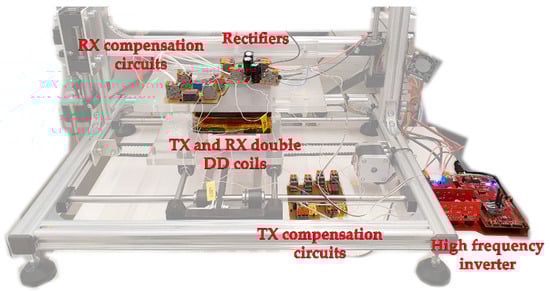 A small-scale IPT system with the proposed PI control scheme was tested, to test if the IPT system using double DD coils can truly be rotationally independent. The parameters of the system are written in Table 4. The operating frequency range was selected in the range of Standard SAE J2954 [19], which proposes an operating frequency around 85 kHz. The resonant circuit was designed for 85 kHz. By selecting the higher switching frequency, in our case 87 kHz, the IPT system operates in the inductive range that enables Zero Voltage Switching [20,21]. The small-scale experimental system is presented in Figure 8. The highlighted elements are the main parts of the IPT system using double DD coils. The system consists of a primary, a transmitter side, and a secondary, a receiver side. The transmitter side consists of the high-frequency inverter with two full bridges, each of which drives its own DD coil, compensated by the TX compensation circuits. On the receiving side, the DD1 and DD2 coils are connected to the RX compensation circuits and rectifiers. The rectifiers are further connected to the resistive load. The TX and RX double DD coils were mounted on the 3D positioning mechanism, which enables controlled movement in 3D space.