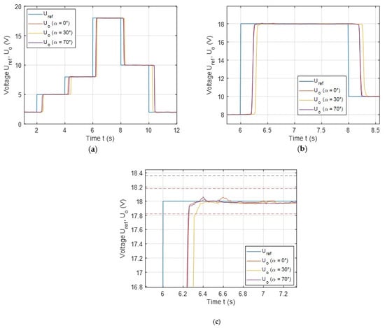 Figure 9 presents the response of the IPT system when changing the reference voltage. The measurements were performed at three different angles α, at 0°, 30°, and 70°. The voltage reference is marked with a blue line. Figure 9a presents the multiple step responses.