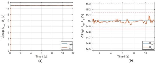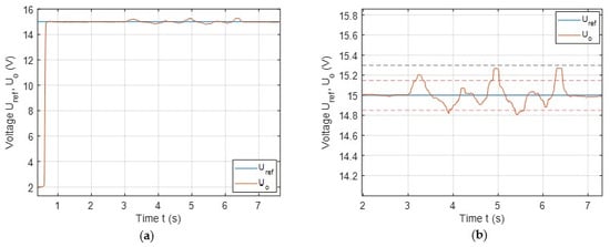 Finally, the influence of the load change on the output voltage is presented in Figure 10. Figure 11a presents the load change influence on the output voltage on the larger scale, and Figure 11b on the smaller scale. The load was changed from 21.4 Ω to 10.7 Ω. The effect of the load change on the output voltage was almost negligible. On the small scale, it can be seen that the biggest difference between the reference value and output voltage was smaller than 0.1 V, or less than 1% of the output voltage.
