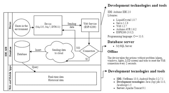 Data capture and alerting method.Figure 4 depicts how IdeAir works from an operational perspective. Gases are detected by the MQ135, MQ7, and DTH-11 sensors, and sent to the cloud via ESP8266 using RESTful Web Services. In case there is no internet connection, the system works locally, issuing alerts and making the necessary decisions to try to ensure adequate air quality. System decision making is based on conditional clauses to determine if significant changes in contamination levels occur, and especially if contamination levels exceed permitted thresholds. The results of this decision making are reflected in the issuance of alerts in the user environment and through the web and mobile applications. Both (web and mobile) applications display real-time data received via WebSocket, as well as displaying historical data by dates via SQL (Structured Query Language) statements and stored procedures executed in the MySQL database via JDBC (Java EE Database Connectivity). Data captured by the sensors integrated into the IdeAir device are preprocessed to detect the aforementioned changes and issue the corresponding notifications regardless of whether there is an internet connection or not. These data are sent for storage when the connection is re-established.