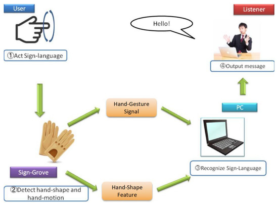 A user wears Sign-Gloves on his/her hands. Furthermore, the user moves the motion of a sign language word. Then, the PC shows the mean of the sign language. A Sign-Glove is a glove-shaped device with a WonderSense device and a bending sensor. WonderSense is the device developed in this laboratory. This model supposed that the user wants to communicate a sign language word motion to another person. We explain the process of this system in Figure 2. A user moves the motion of the sign language word that he/she wants to communicate to another person. Sign-Glove measures the acceleration of hand motion and hand shape at this time. the WonderSense device of the Sign-Glove transmits the measured hand acceleration to WonderBox with Bluetooth low energy. WonderBox is the receiver device of WonderSense. WonderBox sends measured hand acceleration data to a PC with a serial connection. At the same time, the bending sensors of Sign-Glove measure the hand shape. Furthermore, an Arduino board sends measured data with a serial connection. An Arduino is an AVR Micon board and is used for taking data from the bending sensors and sending data to the PC. After the finished sign language gesture, the data values sent by sensors are computed to recognize a sign language word motion. This sign language word motion is converted into a message associated with the sign language word motion in the PC. Finally, the PC displays the message requested by the user. At this time, if the message is a serious one, the PC makes a sound.