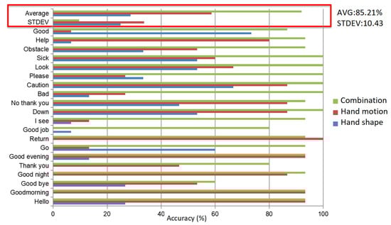 As shown in Figure 10, the recognition ratio of twenty kinds of sign languages in this experiment was obtained. Experiments were performed to calculate the recognition rate of sign language for three kinds of feature data: combined hand motion data and hand shape data, data only based on hand motion, and data only based on hand shape. The motion data of the hand originates from the inertial sensor, which is shown as a red rectangle on the graph. The shape of the hand originates from the bending sensor, which is shown as a blue rectangle on the graph.
