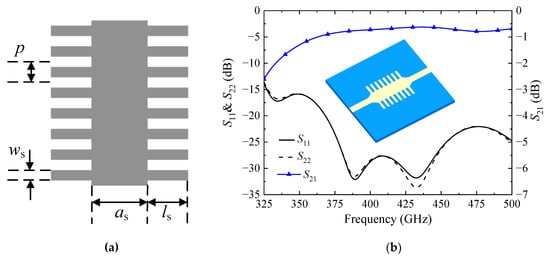 where . The impedance of the CSIW should be equal to Z0 to achieve good impedance matching, so the host waveguide width (as) and the length of open circuit stubs (ls) were further optimized by software. As shown in Figure 4b, S11 < −13 dB and S21 > −2.6 dB are achieved from 325 to 500 GHz for the MSL-CSIW back-to-back transition. In our design, the length of CSIW section is shortened to achieve a compact structure.