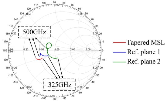 Smith chart of the reflection coefficients from 325 to 500 GHz at the tapered MSL section, at Ref. plane 1 and Ref. plane 2.