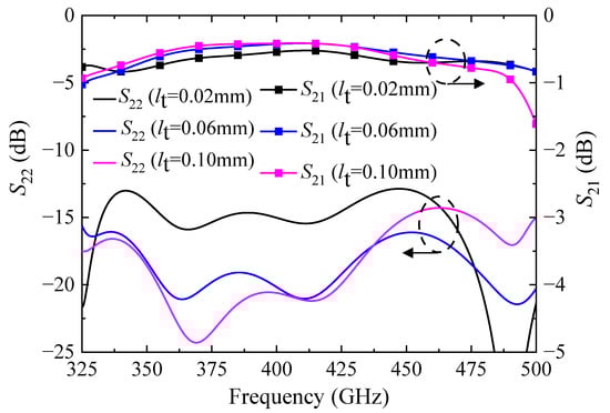 The various lengths of the tapered MSL (lt) are simulated. As presented in Figure 6, the insertion loss is greater at most frequencies when lt = 0.02 mm, and the insertion loss increases near 500 GHz when lt = 0.10 mm. The return loss and insertion loss are both better when lt = 0.06 mm. This illustrates that the length of the tapered MSL cannot be too short.