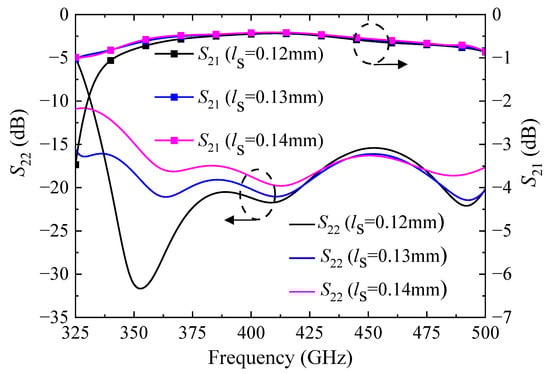 The host waveguide width (as) of CSIW can be designed according to the desired frequency band, the width of open circuit stubs (ws) and the period of CSIW units (p) are designed according to reference []. Afterwards, the length of open circuit stubs (ls) is analyzed. As shown in Figure 7, when ls = 0.12 mm, the PMC sidewall formed by CSIW units is not able to cover the entire band, which results in an insertion loss of 3.5 dB at 325 GHz. When ls ≥ 0.13 mm, the PMC boundary can cover 325–500 GHz. For ls = 0.14 mm, the coupling between open circuit stubs and air-filled RWG becomes more obvious, the S22 becomes slightly worse than ls = 0.13 mm. As a result, ls = 0.13 mm is selected.