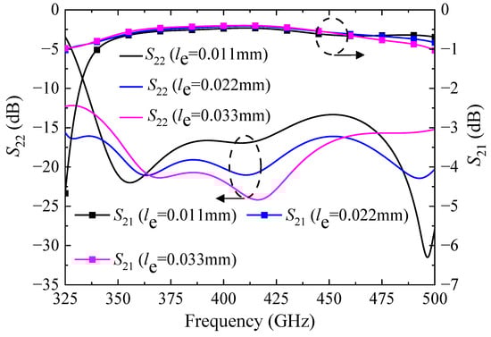 Finally, the parameter le is studied. It determines the distance between open circuit stubs and the RWG transformer. As shown in Figure 8, when le = 0.011 mm, the insertion loss at the lower border frequency rises significantly; when le = 0.033 mm, the insertion loss rises at the higher border frequency; and when le = 0.022 mm, the S-parameters are the best from 325 to 500 GHz. When le changes, the period (p) of CSIW units is changed correspondingly, and the operating frequency band of the PMC is shifted. By setting the proper value of le, a broadband transition can be achieved.