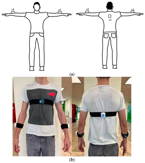 Wearable sensors as placed on the subject’s body ((a) scheme, (b) real), s1 on the upper shoulder, s2 and s3 on the forearms.