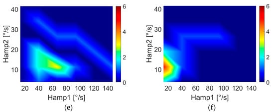 Two-dimensional features’ distributions for HC subjects ((a) “least affected” side, (b) “most affected” side), PD-DN patients ((c) “least affected” side, (d) “most affected” side) and PD-OFF patient€ ((e) “least affected” side, (f) “most affected” side). The colors are related to the number of subjects. Color bar limits of PD-OFF plots are lower with respect to the other plots because of the smaller population.