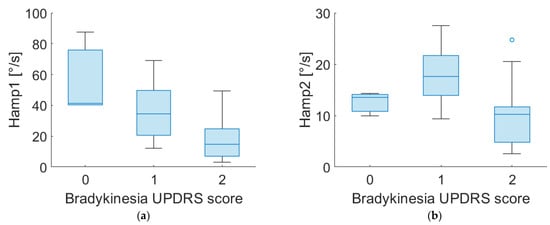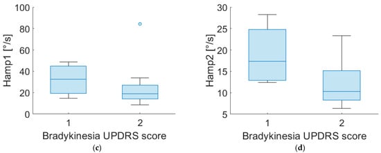 Boxplot of Hamp1 and Hamp2 of “most affected” side for PD-DN (a,b) and PD-OFF (c,d) subjects for different scores of UPDRS item no. 3.14 (bradykinesia).