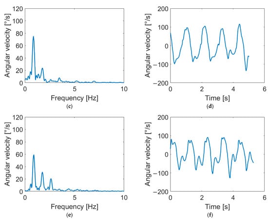 Arm-swing signals in frequency and time domains for different harmonic content. Signals reported show negligible distortion (a,b), second-harmonic distortion (c,d) and third-harmonic distortion (e,f). As shown in the figure, the second harmonic corresponds to a flattening of negative peaks in the time domain, while the third harmonic causes a flattening of both positive and negative peaks.