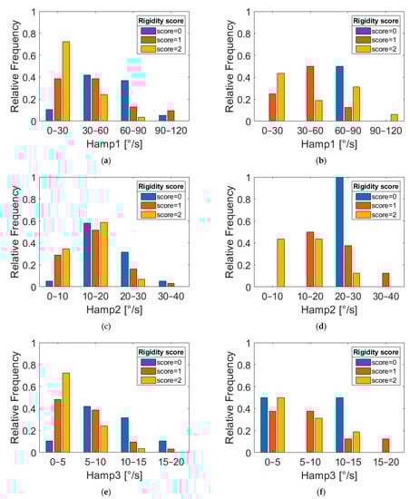 Relative frequency distributions of features Hamp1, Hamp2 and Hamp3 for PD-DN (a,c,e) and PD-OFF (b,d,f) subjects grouped according to three different UPDRS rigidity scores (item 3.3).