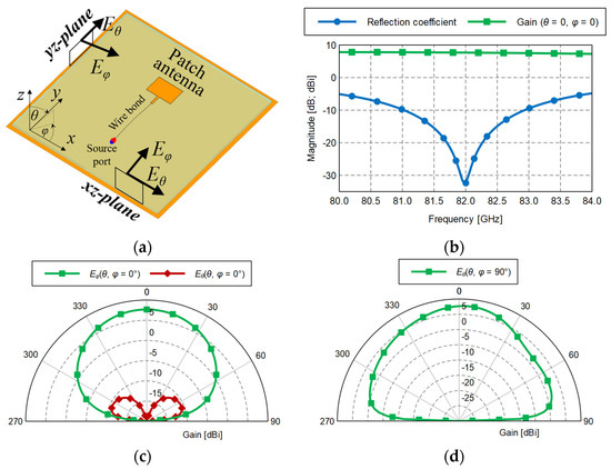 Wire-bonded patch antenna: (a) simulation model; (b) reflection coefficient and gain; (c) co-polarized and cross-polarized radiation patterns in xz-plane; (d) co-polarized radiation pattern in yz-plane (the cross-polarization pattern in yz-plane is not shown because its values are less than −80 dBi) [43].