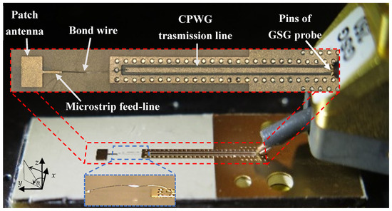The theoretical design presented in the previous section gives a good understanding of the radiating mechanism; however, it is incompatible with standard measurement instruments, which use coaxial or coplanar ground-signal-ground (GSG) interfaces. Therefore, the theoretical design was modified to obtain an experimental design which, after fabrication, could be evaluated experimentally. The main modification comes with adding a 9.55-mm-long coplanar waveguide with ground (CPWG) line to provide an interface for the GSG measurement probe (in case of the reflection coefficient measurements) or the CPWG-to-coax adapter (in case of the radiation pattern measurements). Dimensions of the CPWG line were calculated to achieve the characteristic impedance of 50 Ω. Vias with a diameter of 0.2 mm and spacing of 0.4 mm were added along the edge of the top ground plane surrounding the line to avoid propagation of surface wave in the substrate. Dimensions of the experimental design were reoptimized taking into account many variables, including dimensions of the patch antenna, wire bond, and CPWG line. A photograph of the antenna, fabricated according to obtained experimental design, is presented in Figure 2.