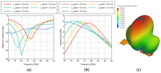 Simulations of the experimental design having different wire bond lengths around one wavelength: (a) reflection coefficient; (b) realized gain (reflection loss included), broadside direction; (c) radiation pattern at 80 GHz for the bond length of 3.0 mm.