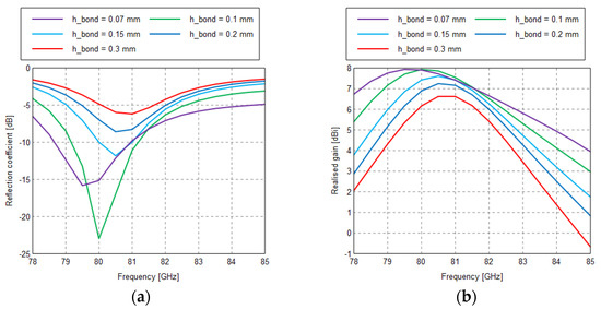 Simulations of the experimental design having different wire bond heights: (a) reflection coefficient; (b) realized gain (reflection loss included), broadside direction.