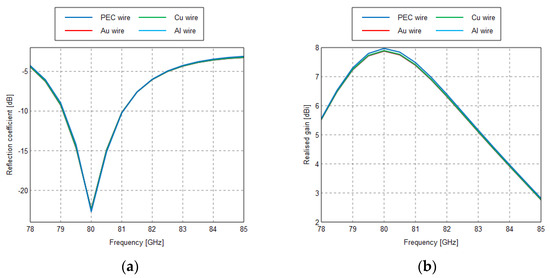 Simulations of the experimental design for various wire materials: perfect electric conductor (PEC), copper, gold, and aluminum: (a) reflection coefficient; (b) realized gain (reflection loss included), broadside direction.