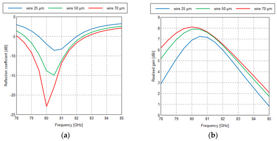 Simulations of the experimental design for different wire bond diameters: (a) reflection coefficient; (b) realized gain (reflection loss included), broadside direction.