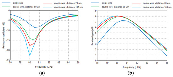 Simulations of the experimental design for different spacing between two parallel wire bonds: (a) reflection coefficient; (b) realized gain (reflection loss included), broadside direction.