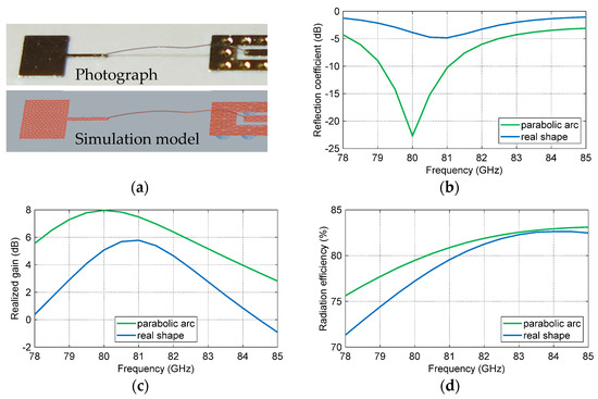 Simulations of two different wire bond shapes: parabolic arc of 0.1 mm height and real bond shape of 0.23 mm height (a) photograph of the manufactured structure and the model with real bond shape; (b) reflection coefficient; (c) realized gain (reflection loss included), broadside direction; (d) radiation efficiency.