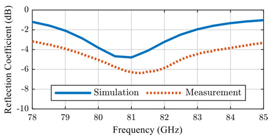 The fabricated antenna was firstly measured for the reflection coefficient. The measurement setup included the Cascade Microtech PM8 EPS200MMW manual probe system with ACP110 GSG probe, Agilent PNA-X N5245A vector network analyzer (VNA), and the Virginia Diodes (VDI) WR-10 (75–110 GHz) waveguide frequency extender. The setup was calibrated using impedance standard substrate with reference plane at the probe’s contact pads.