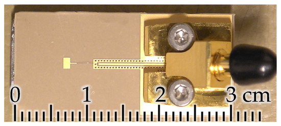 Finally, 2.92-mm-long aluminum wire bond with a diameter of 25 µm was added. The antenna after all fabrication stages is presented in Figure 2.