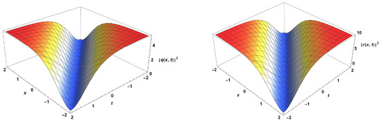 These relations (68)–(73) represent the solutions of the models (1) and (2) that were the main equations and that were the goal of this paper. These soliton solution structures are now subjected to their classification. The solutions (68) and (69) are straddled solitons since they remain straddled between purely bright and purely dark solitons. Next, upon choosing convenient parameter combinations, namely or , it is the pure bright or pure singular soliton solutions that emerge. These are represented by the pairs (70)–(71) and (72)–(73), respectively. Thus, the mathematical scheme that is adopted here to address the governing equations, namely the enhanced Kudryashov approach, reveals three forms of solitons, which are straddled solitons and pure bright and pure singular solitons although the bright and singular solitons are a byproduct of the straddled solitons with a subtle choice of the free parameters.