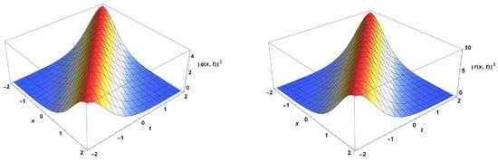 The surface plots of solitons (60) and (61) are depicted in Figure 2. The parameter values chosen are: and .