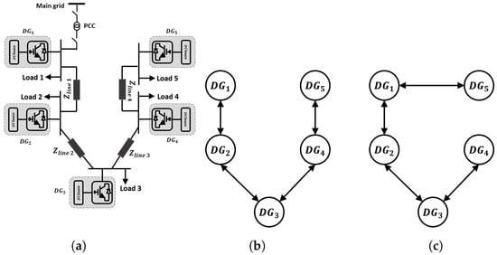 (a) A schematic diagram of the studied AC microgrid test system. (b) Communication graph for Section 4.1. (c) Communication graph for Section 4.4.