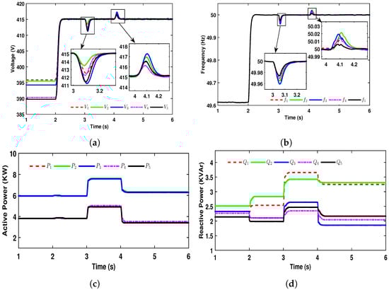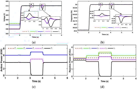 Performance analysis of proposed controller. (a) Voltage. (b) Frequency. (c) Active power. (d) Reactive power.