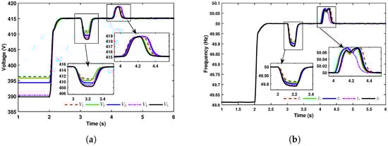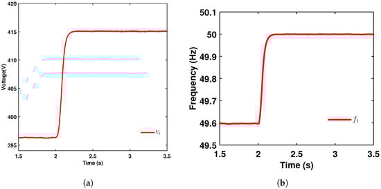 The communication links have an inherent link latency due to the data traffic and distance between the DGs, which is usually not larger than 100 ms. This adversely affects the controller efficacy and may result in system instability for larger link delays []. The link delay analysis is presented in this case. The measured information of the neighboring DG unit, i.e., the voltage magnitude, operating frequency, and active and reactive power outputs, is delayed which further results in an increased convergence time. For this analysis, we considered three fixed link delays as of 100 ms, 1 s, and 2 s. The proposed controller has an insignificant effect for the delays ms and s, as seen from Figure 10. For longer link delays, the proposed controller synchronizes the voltage and frequency with a slightly longer convergence time with moderate ripples. For the communication delay s and s, the proposed scheme restores the voltage and frequency in approximately 0.31 and 0.42 s, respectively, as shown in Figure 11.