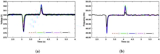 To demonstrate the robustness of the proposed control technique, the inclusion and removal of the load are considered. The communication topology used is shown in Figure 4b. The secondary control parameters are given in case 1, Table 2. The simulation is pursued in four steps: