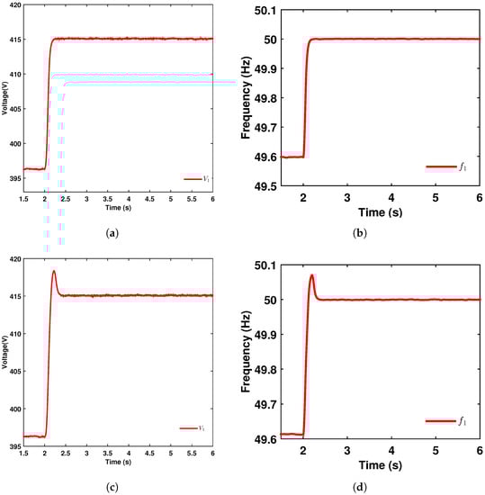 During stage 1 of the operation, the primary control layer is active, which results in voltage and frequency deviations from their reference values, as shown in Figure 5. During the second step of the operation, at s, the proposed secondary restoration algorithm is activated and the voltage and frequency for each DG unit are restored to their nominal values V and Hz) in finite-time s. At s, an RL load of mH is added in load 1, and at s, load 3 is removed from the MG network. The presented scheme is effective in rejecting the load changes and tight voltage, and the frequency restoration is observed with a small transient time. Active power is shared in accordance with the DG ratings, as shown in Figure 5c, and the reactive power results show a small mismatch because of the MG line impedance, as shown in Figure 5d, and the power-sharing works in a longer time frame. Thus, the proposed restoration algorithm is effective in rejecting the load variation in the MG.