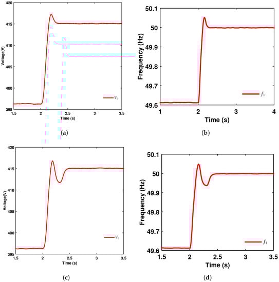 The data dropout or packet loss that occurs in the communication system negatively affects the efficacy of the controller. The packet loss means the loss of the measured information of the neighboring DG unit (the voltage magnitude, operating frequency, and real and reactive power outputs) is lost. The excessive packet loss leads to significant variations in the voltage and frequency terms. Here, two situations of data dropout are simulated. In the first case, the data dropout takes place every 30 ms in all the links, and in the second case, it is every 10 ms in all the links considering 100 ms of communication delay. The proposed synchronization algorithm remains robust for the 1st case, as shown in Figure 9a,b, and for the 2nd case, the response is not significantly affected, as seen from Figure 9c,d.