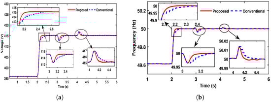 Comparative analysis. (a) Voltage magnitude. (b) Frequency.