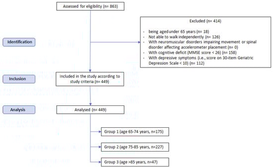 During the period November 2019 to June 2022, 863 older adults were screened for eligibility at the Center for Cognitive Disorders and Dementia (in collaboration with the Geriatric Unit of “SS. Trinità” General Hospital, Cagliari, Italy) and the University of Milan (Milan, Italy). Eligibility criteria included: (1) age over 65 years; (2) ability to walk independently (i.e., without an assistive device or the assistance of another person); (3) being free from either neuromuscular disorders impairing movement (including but not limited to Parkinson’s disease, stroke, and multiple sclerosis) or spinal disorder affecting accelerometer placement; (4) being cognitively intact (i.e., MMSE score > 26); and (5) being free from depressive symptoms (i.e., score on 30-item Geriatric Depression Scale > 10).