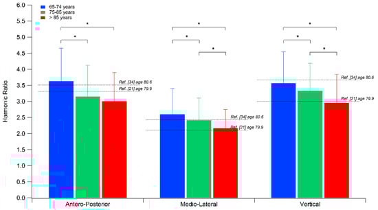 As regards HRs, the values calculated in the present study are quite consistent with those previously reported for individuals of similar age ranges [,,,,]. For example, in Lowry et al. [], the adults aged 80–86 years exhibited lower HR in the AP and V directions compared to those aged 60–69 years, and no differences in the ML direction were detected between the Groups. In Brach et al. (2011) [], older adults (mean age: 77.5 years) had lower HR in the AP direction than young adults (mean age = 24.4 years).