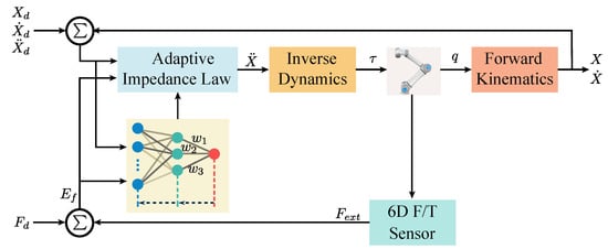 In the last few years, compliant control has been widely used in polishing, assembly, dual-arm coordination, human–robot interaction, and other fields. Classical compliant control methods include hybrid or parallel force/position control, impedance, and admittance control. Compared with the passive compliance with mechanical structures, active compliant control realized within software is applied in a wider field of robotics []. Impedance control, as a typical active compliant control method, has been evolving since its first proposal by Hogan in 1985 []. In contrast to position-based admittance control, impedance control is a torque-based control method. However, there are usually unknown dynamics such as friction, modeling uncertainties, and external disturbances in robotics system, which can significantly limit the precision of impedance control.