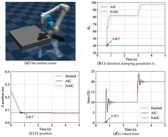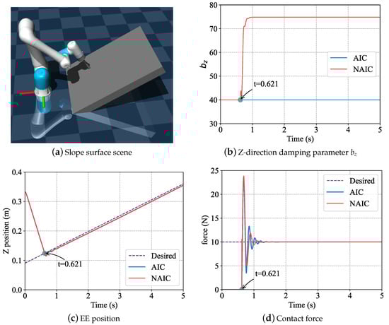 Another simulation was carried out for the slope-shaped environment, as shown in Figure 4a. Compared with flat surface simulation, m/s and m/s2 when the robot is in contact with the environment. The desired force is set to 10 N, and the initial damping parameter in the Z-direction is 40 N·s/m for both NAIC and AIC.